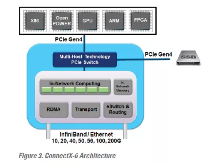 ConnectX-6和Quantum支持新一代数据中心架构(以数据为中心的架构),在该架构中,网络成为分布式处理器。通过添加额外的加速器,ConnectX-6和Quantum可实现网络内计算和网络内存储功能,将进一步的计算任务转移到网络中,从而节省了CPU调度周期,提高了网络的效率。