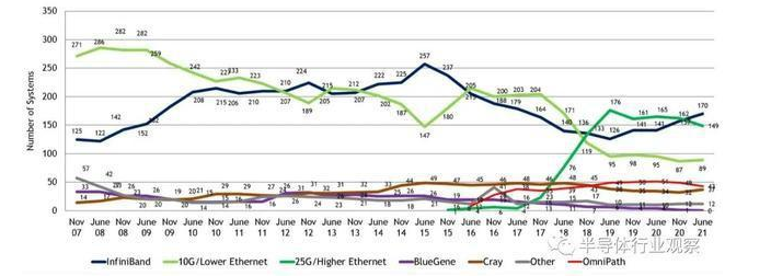 很明显,InfiniBand 会随着时间的推移而起伏不定,在此图表所示的 13 年半中,10 Gb/秒和较慢的以太网在较小程度上一直在减弱。InfiniBand 正在崛起,其 Omni-Path 变体(由英特尔控制,现在由 Cornelius Networks 所有)一直保持稳定,直到 2021 年 6 月的名单有所下滑。以 25 Gb/秒或更高速度运行的以太网一直在上升,但是,在 2017 年至 2019 年间增长更快,当时 100 Gb/秒交换(通常是 Mellanox Spectrum-2 交换机)比前几代 100 Gb/sec 技术更快,它依赖于更昂贵的传输,因此大多数 HPC 不会考虑。
