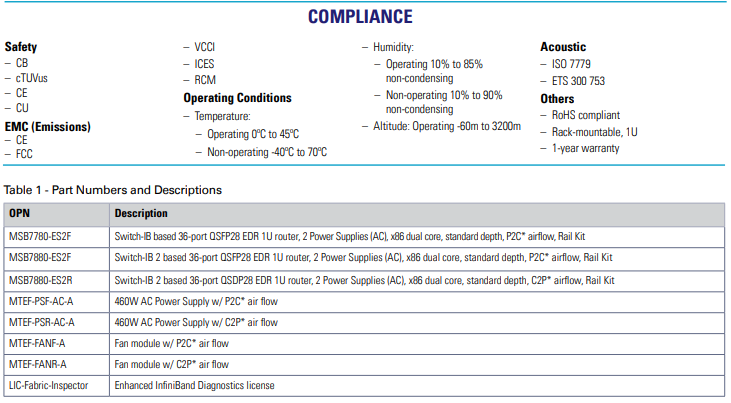 NVIDIA MSB7780-ES2R 交换机基于 EDR 因菲尼班德 1U 路由器 36 QSFP28 端口 2 电源交流 x86 双核标准深度 C2P 气流铁路套件 RoHS6 36 端口非阻塞托管 EDR 100Gb/s Infiniband 路由器 高性能计算 (HPC)、人...