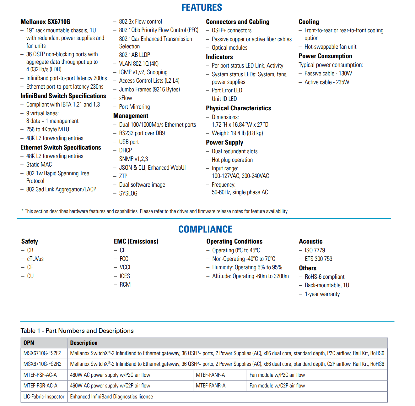 SX6710G 是一款高性能、低延迟 56Gb/s FDR InfiniBand 至 40Gb/s 以太网网关。InfiniBand 采用基于 SwitchX-2 的交换机构建,提供完全的端口灵活性,可在 56Gb/s InfiniBand 到 10、40 和 56Gb/s 以太网之间进行选择,延迟度低 400n。SX6710G 与 ConnectX 主机适配器系列相结合,通过在单条线路上集成两个网络来节省成本。在单个电线上整合多个网络可同时节省资本支出和 OPEX。OPEX 通过降低布线复杂性、减少交换机和服务器基础设施以及提供一致且易于使用的管理软件来节省开支。