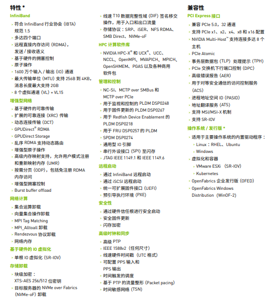 利用网络计算来加速数据驱动的科学计算 作为 NVIDIA® Quantum-2 InfiniBand 平台的关键组件,NVIDIA ConnectX®-7 智能网卡 (HCA)具备出色的网络性能,能够应对全球极具挑战性的问题。ConnectX-7 InfiniBand 网卡支持超低延迟、400 Gb/s 吞吐量和创新的 NVIDIA 网络计算引擎,能够为高性能 计算(HPC)、人工智能(AI)和超大规模云数据中心提供所需的加速能力、可扩展性和 功能丰富的技术。